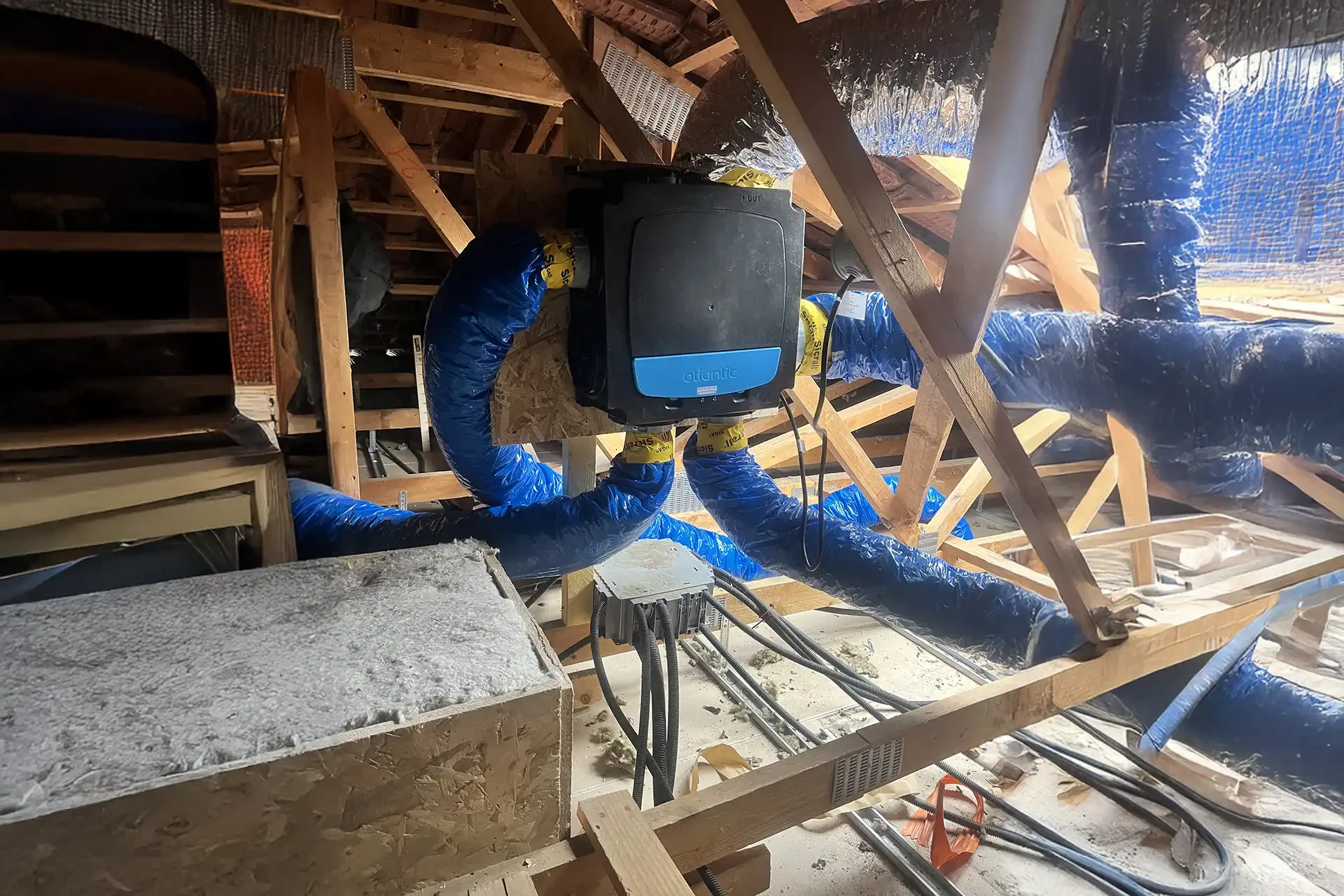 Nous procédons à la mise en place des gaines isolées, au branchement du moteur, au montage des bouches et à l'aménagement de la sortie en toiture. Nous veillons à l'étanchéité parfaite de l'ensemble du circuit et à la compatibilité avec vos appareils à combustion existants.